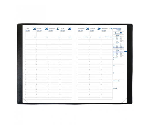 L’agenda semainier permet d’organiser facilement votre semaine, avec un espace personnalisé chaque mois et séparé par une feuille intercalaire conçue pour mettre en valeur votre activité, l’agenda est imprimé sur papier laser de 80g à 115g pour les pages intérieures, l’intercalaire sur papier couché mat ou brillante 135 ou 170g et la couverture sur papier rigide de 300g, l’assemblage est effectué avec spirale métallique ou avec encollage en dos carré collé.
